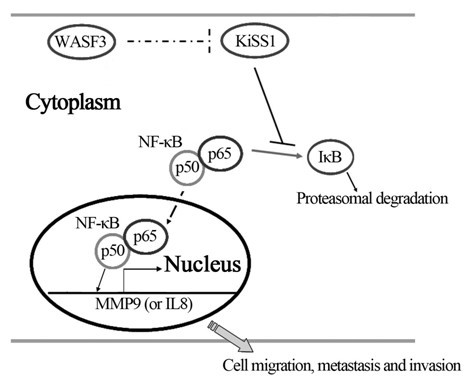 該文第一作者,美國喬治亞醫學院的滕勇博士(生物谷旗下生命科學論壇資深版主)認為,腫瘤侵染和轉移是影響惡性腫瘤患者預后的關鍵因素,它是一個多步驟,多因素參與的復雜過程,涉及腫瘤細胞的生物學特性和結構變化等。WASF3和WASF1、WASF2同屬于WASP家族Verprolin同源蛋白, 它是參與調控細胞骨架的重要肌動蛋白,具有促進腫瘤遷移的功能。實驗小鼠模型和臨床樣本顯示WASF3可高表達于惡性乳腺癌和前列腺癌組織,如果敲除WASF3基因可顯著抑制腫瘤的發生和發展。其可能作用機制之一為WASF3可通過減少細胞應力纖維,刺激形成一種叫Lamellipodia的細胞膜亞結構從而促進腫瘤細胞的遷移。KISS1是近年克隆的一個新型腫瘤轉移抑制基因,其表達缺失與人類乳腺癌等多種惡性腫瘤的轉移有關。在腫瘤細胞中WASF3和KISS1這兩個具有相反功能的基因究竟有怎樣的內在聯系呢?如果有,那么會不會存在一條相互調控的信號通路呢?"Functional interrelationship between the WASF3 and KISS1 metastasis associated genes in breast cancer cells"一文數據顯示在WASF3基因沉默的乳腺癌細胞系中,與細胞遷移和黏附有關的基質金屬蛋白酶MMP9的表達量顯著降低,而這一結果是因為WASF3可負調控于KISS1,而后者表達量的劇增可顯著抑制NFκB通路活性,從而通過阻斷NFκB p65/50亞基團從細胞質轉移到細胞核內的進程,導致無法啟動由p65/50主導調控的包括MMP9在內的眾多原癌基因的轉錄和表達。結果還顯示,WASF3可通過抑制KISS1的胞外分泌增強腫瘤細胞對TNFα刺激的敏感性,加快細胞的遷移和侵染。
