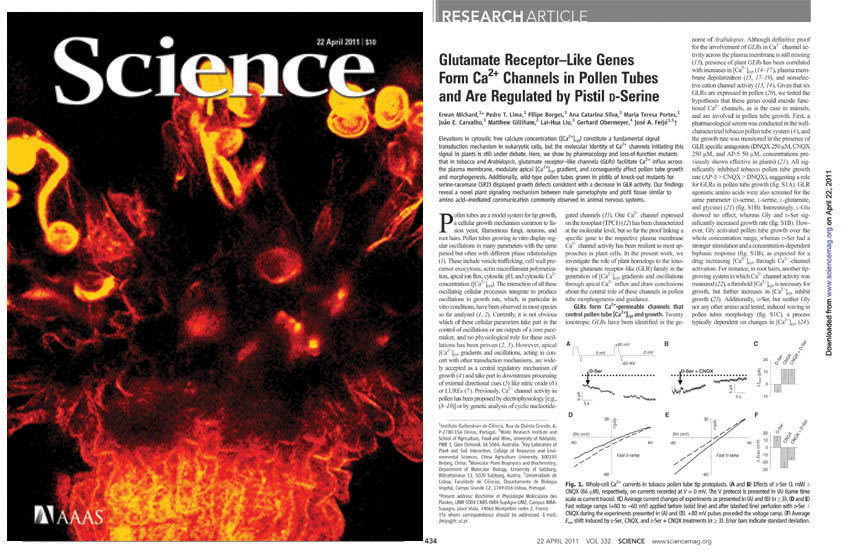 中國農業大學資環學院劉來華教授課題組與葡萄牙里斯本大學J.A. Feijó教授合作的研究論文“谷氨酸受體類基因在花粉管中形成鈣離子通道且受雌蕊中的D-絲氨酸調控”(Glutamate Receptor–Like Genes Form Ca2+ Channels in Pollen Tubes and Are Regulated by Pistil D-Serine)以封面文章的形式發表在4月22日出版的SCIENCE雜志上。 胞質中游離鈣離子濃度([Ca2+]cyt)的升高或鈣振蕩是真核細胞信號轉導機制的最基本組成部分,它涉及到幾乎所有的生物學事件。然而,激發植物信號轉導的鈣離子通道的分子基礎一直未明確,長期以來被列為理論學術界極力研究和爭論的熱點。迄今,植物體中轉運鈣離子跨越細胞質膜的載體尚未知。 我校和里斯本大學專家們運用藥理學、電生理學以及基因功能缺失的突變體等研究技術,首次在煙草和擬南芥中發現谷氨酸受體類離子通道(glutamate receptor–like channels, GLRs)利用D-絲氨酸(D-Serine)作為配體(ligand)而介導鈣離子的跨質膜內流,進而調節花粉管頂端細胞的[Ca2+]cyt梯度,最終影響花粉管的生長及其形態建成。研究還發現,在絲氨酸消旋酶基因被敲除的擬南芥突變體(SR1)中,野生型植物的花粉管在SR1雌蕊中的生長發生缺陷并伴以GLR(GLR1.2,GLR3.7)的鈣離子通道活性降低。上述研究成果首次闡明了高等植物GLR家族成員需要特定的配體物質以開啟其鈣離子通道功能,以及與此直接關聯的系列分子生理學事件-胞質鈣振蕩與花粉管發育;揭示了植物雄性配子體與雌蕊組織之間相互識別、生長適應的一種全新生物信號機理,此類似于動物神經系統中普遍存在的由氨基酸開啟的信息交流機制。這不僅是植物分子生物學上的重大發現,而且對微生物學、動物學、生物醫學等其他領域的研究也具有重要的學術參考價值。在這篇SCIENCE文章中,我校為第三完成單位,劉來華教授為第八作者。 動物中樞神經系統中,氨基酸是神經興奮信號的重要傳遞介質。通常,谷氨酸、甘氨酸(Glu, Gly)作為配體與谷氨酸受體離子通道蛋白(iGLuR)專性結合,調節通道對陽離子如Ca2+ 、K+、Na+ 等的運輸活性,從而實現對興奮信號的傳遞。神經細胞的發育過程中,Glu等亦作為化學誘導物,通過與iGLR蛋白結合而開啟其離子通道功能,以引導神經細胞的生長發育運動?;蚪M密碼的破譯及功能基因的預測表明谷氨酸受體基因普遍存在于微生物和動植物中。 擬南芥及水稻基因組中存在與動物的谷氨酸受體(iGluRs)相似的基因家族,即AtGLR, OsGLR, 此兩類家族均含有20個成員基因。據現有的研究報道推測,植物GLR可能參與許多重要的生物學過程,如:光信號傳遞,感應碳/氮平衡狀態,控制ABA等激素的生物合成,維持根尖分生細胞的活性,調控植物中的鈣離子流,應答多種環境脅迫等。然而,學術界迄今還未能在分子和生理(表型)水平上精確地闡明該基因家族中絕大多數成員應具有的生物學功能。 近年來,劉來華教授課題組與多國學者合作,已分離、鑒定、獲得了擬南芥中所有20個GLR基因的T-DNA純合型突變體,目前正運用各種分子生理學手段對AtGLR的生物學功能進行全面的剖析、鑒定。劉來華教授表示,課題組感謝相關部門和單位給予的支持,并歡迎國內外同行的合作與指導,共同在這一研究領域取得更大的突破。 |