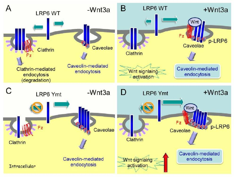 Wnt/β-catenin信號通路在發育過程中對細胞生長、細胞分化和細胞存活起關鍵作用。該信號通路失調將導致各種人類疾病,尤其是癌癥。作為Wnt/β-catenin信號通路的一個重要共同受體,低密度脂蛋白受體相關蛋白6(LRP6)的內吞作用和磷酸化在介導Wnt/β-catenin信號傳導中發揮了至關重要的作用。然而,它調控機制仍不完全清楚。 卜國軍教授課題組的研究成果揭示了LRP6的內吞途徑調節其磷酸化和Wnt/β-catenin信號強度的分子機制,這也暗示了在人類疾病中該信號通路是如何受到了調節。該研究成果也開發靶向該信號通路的治療手段的發展也有十分重要的意義。 原文摘要: Tyrosine-based Signal Mediates LRP6 Endocytosis and Desensitization of Wnt/β-catenin Signaling Chia-Chen Liu, Kanekiyo Takahisa, Barbara Roth and Guojun Bu Wnt/β-catenin signaling orchestrates a number of critical events including cell growth, differentiation and cell survival during development. Misregulation of this pathway leads to various human diseases, specifically cancers. Endocytosis and phosphorylation of the LDL receptor-related protein 6 (LRP6), an essential co-receptor for Wnt/β-catenin signaling, play a vital role in mediating Wnt/β-catenin signal transduction. However, its regulatory mechanism is not fully understood. In this study, we define the mechanisms by which LRP6 endocytic trafficking regulates Wnt/β-catenin signaling activation. We show that LRP6 mutant with defective tyrosine-based signal in its cytoplasmic tail has an increased cell surface distribution and decreased endocytosis rate. These changes in LRP6 endocytosis coincide with an increased distribution to caveolae, increased phosphorylation, and enhanced Wnt/β-catenin signaling. We further demonstrate that treatment of Wnt3a ligands or blocking the clathrin-mediated endocytosis of LRP6 lead to a redistribution of wild-type receptor to lipid rafts. The LRP6 tyrosine mutant also exhibited an increase in signaling activation in response to Wnt3a stimulation compared to wild-type LRP6, and this activation is suppressed when caveolae-mediated endocytosis is blocked. Our results reveal molecular mechanisms by which LRP6 endocytosis routes regulate its phosphorylation and the strength of Wnt/β-catenin signaling, and have implications on how this pathway can be modulated in human diseases. |