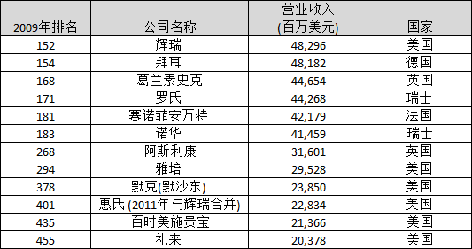 2009年財富500強(qiáng)制藥公司排名 本排行榜按照截止日不晚于2013年3月31日的財務(wù)年度的營業(yè)收入對公司進(jìn)行排名。所有上榜公司必須公布其財務(wù)數(shù)據(jù)并將部分或全部數(shù)字提交政府機(jī)構(gòu)。數(shù)字以各公司報告為準(zhǔn),比較對象為最初報告的上一年數(shù)字?!敦敻弧冯s志不因會計規(guī)則變化而重新確定上一年的數(shù)字。如欲了解雇員人數(shù)、首席執(zhí)行官、公司總部、官方網(wǎng)站、收入年增減情況等更詳細(xì)內(nèi)容,請詳細(xì)點擊相應(yīng)公司的官方網(wǎng)站。