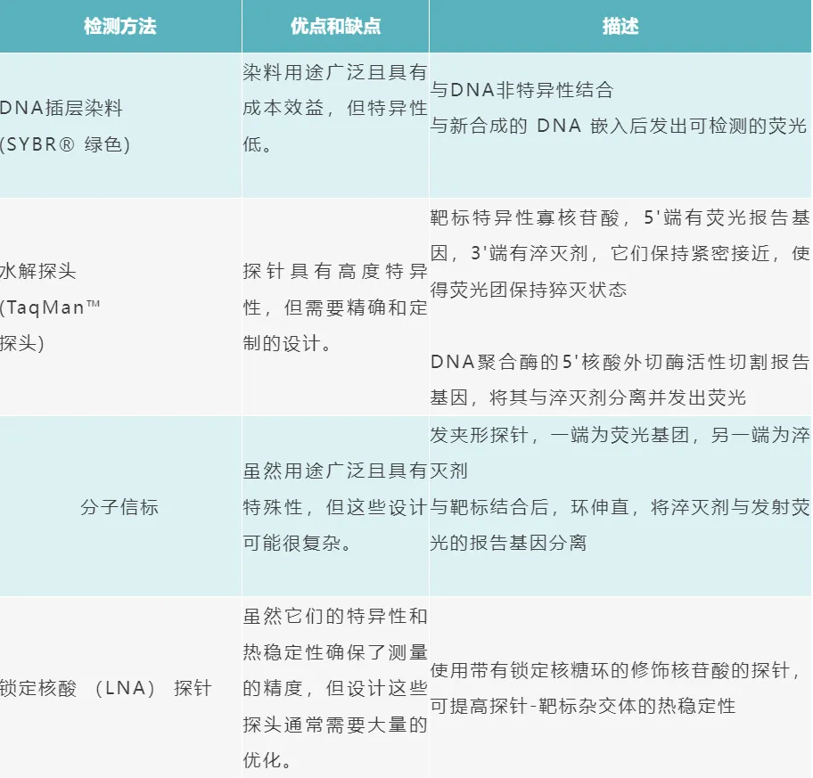4. 環境監測:qPCR能夠高效檢測水體、土壤及空氣中微生物群落的變化,評估環境質量,監測污染源的生態影響,為環境保護和治理提供依據。 5. 臨床診斷:qPCR已成為多種疾病診斷、預后評估及治療效果監測的重要手段。通過檢測患者體內特定基因或病原體的表達水平,醫生能夠制定更加精準的治療方案。 03、qPCR 的工作原理 qPCR反應的核心開始于一個混合體系,該體系包含了DNA聚合酶、脫氧核苷酸三磷酸酯(dNTPs,作為DNA合成的原料)、特定設計的引物(用于識別并啟動DNA鏈的延伸)、熒光染料或報告探針(用于實時監測DNA擴增過程),以及待檢測的模板DNA。 04、qPCR 的關鍵步驟 變性階段:在高溫條件下(常規設定為94°C至98°C之間),雙鏈DNA解開成單鏈DNA。 退火階段:在溫度稍低的環境中(大約50°C至70°C之間),使設計的引物與模板DNA中的目標區域相結合,形成引物-模板DNA復合物。 延伸階段:在DNA聚合酶的催化作用下,溫度調至酶活性的范圍(通常在68°C至72°C之間),酶沿著引物結合的起點,以模板DNA為模板,逐個添加核苷酸,產生兩條互補的 DNA 鏈,形成雙鏈DNA。 定量完成階段:在每一輪DNA補充時,通過熒光計測量并記錄這些熒光信號,以做定量分析。 05、qPCR 檢測方法 常見的qPCR檢測方法包括DNA插層染料、水解探針、分子信標和LNA探針。 06、qPCR的引物設計注意事項 引物的設計長度推薦在15至30個堿基對之間,這樣有助于70至200個堿基對的目標序列進行高效互補。 為確保PCR反應的順利進行,所選用的正向和反向引物應具有相近的熔解溫度(Tm),理想范圍設定在60°C至65°C之間。 引物的3'端應充足GC,可以提升引物與模板DNA結合的效率和提高熔解溫度。引物的GC含量應控制在40%至60%之間,以達到最佳的擴增梯度、穩定性和擴增效率。 退火溫度通常建議比引物的Tm值低約5°C,這樣做是為了減少非極化的可能性。 07、qPCR常見問題及解決方法 問題1.qPCR 擴增效率低 問題原因: 試劑與反應體系因素:如試劑降解、過期或保存不當導致的活性降低。或者加液量不足或成分比例不當而導致效率低。 引物與標記設計問題:引物和熒光標記(或探針)的設計存在缺陷。包括引物與模板DNA的結合力不夠強、引物間形成二聚體、產物長度過長以及未能充分優化反應條件。 解決方法: 保證所有qPCR試劑質量良好,嚴格按照說明書儲存和使用。確保加液量準確無誤,以減少操作誤差。 利用文獻資源或專業設計軟件重新設計引物和標記。以確保產物長度控制在80到150堿基對之間,同時,根據引物的特性調整和優化PCR反應條件。