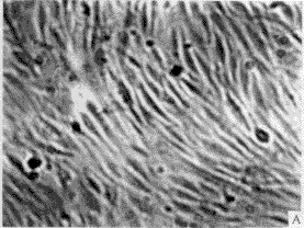 a: Primary cells at passage (P) 3,characterized by stretching well, growth with direction and contact-inhibition; B: Primary cells were introduced by blank vectors, All of them died after 5 days with G418 400 mg/L ×100
