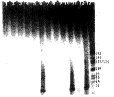 2.4.2.1電泳 取TRAP產(chǎn)物30 m l及標準分子量(PBR322DNA/HaeIII)1 m g,分別與適量加樣緩沖液混合上樣進行12%的聚丙烯酰胺凝膠電泳,電壓200 V,恒壓電泳4 h。