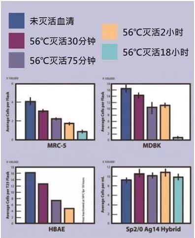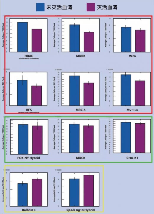萬一小艾設(shè)錯水浴溫度或忘記按計時器,都會導(dǎo)致過高的加熱溫度(下圖2)或過長的加熱時間(下圖3),進而大大降低血清的功能,影響細胞生長的表現(xiàn)。 ▲圖2:過高的加熱溫度降低大多細胞株生長速度(僅一株未受明顯影響)。 ▲圖3:過長的加熱時間降低大多細胞株生長速度(僅一株未受明顯影響)。 且滅活加熱過程會增加血清的沉淀狀況,而沉淀又常常被認為是微生物的污染,進而耗費大量時間及精力驗證是否污染,導(dǎo)致實驗一再拖延。 我的細胞一定要用滅活血清怎么辦?