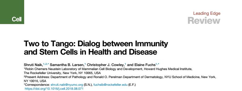 [1] Shruti Naik, Samantha B. Larsen, Christopher J. Cowley, and Elaine Fuchs. Two to Tango: Dialog between Immunity and Stem Cells in Health and Disease. Cell, 2018.
