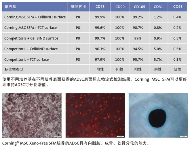 間充質干細胞屬于原代細胞,會受到供體差異,組織來源差異及傳代次數的影響,細胞在培養過程中會出現較大的差異。 Corning® MSC Xeno-Free SFM可支持脂肪、臍帶和骨髓來源的間充質干細胞生長,細胞形態與間充質干細胞表面標志物表達正常,并且擴增倍數和穩定性整體表現良好。