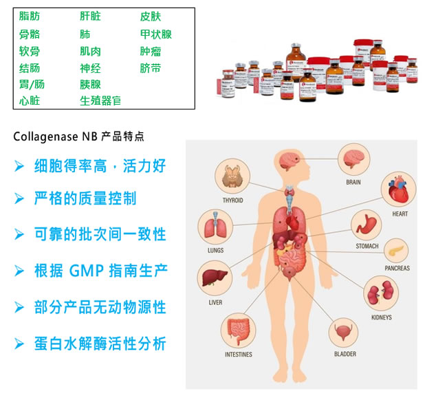 Collagenase NB 是德國(guó) Nordmark 制藥公司提供的高品質(zhì)膠原酶 NB 產(chǎn)品系列,特別適用于從各種組織中分離細(xì)胞。嚴(yán)格的生產(chǎn)標(biāo)準(zhǔn)確保了可靠的批次間一致性和卓越的性能。膠原酶 NB 系列是旨在獲得高產(chǎn)活細(xì)胞的研究人員的首選。組織消化酶是組織工程和人體移植的關(guān)鍵原材料。以下列舉了使用 Nordmark 膠原酶 NB 產(chǎn)品成功分離的器官和組織: