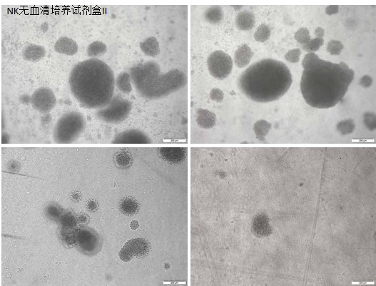 樹突狀細胞附著在培養(yǎng)瓶表面上,而NK細胞經培養(yǎng)會形成較小的細胞團塊。該細胞團塊的體積會隨著細胞密度的上升而增加。圖1顯示培養(yǎng)第10天后NK細胞在不同培養(yǎng)基中的形態(tài)。NK培養(yǎng)試劑盒和NK無血清培養(yǎng)試劑盒II的培養(yǎng)液中觀察到的細胞團塊遠多于競爭產品I和競爭產品Y的培養(yǎng)基中觀察到的細胞團塊。