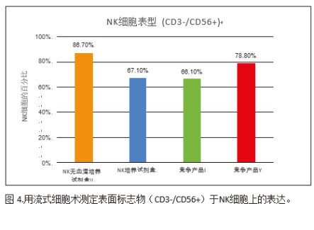 NK細胞的特異表面標志物為CD3-/CD56+。流式細胞的分析結果 顯示使用NK無血清培養(yǎng)試劑盒II可獲得86.7%的NK陽性細胞,而使用競爭產品I和競爭產品Y的培養(yǎng)試劑盒則獲得相對較少的NK 陽性細胞(分別為66.1%和78.8%),數據如圖4所示。