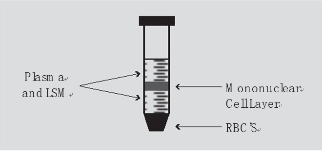 淋巴細胞分離液 (LSM) 可用于在體外從稀釋的全血中進行淋巴細胞的分離。其分離原理為密度梯度離心,利用全血中不同細胞類型比重的差異通過離心完成細胞的分離 (圖1)。康寧 cellgro®淋巴分離液是一種無菌的等滲聚蔗糖和泛影酸鈉溶液,粘度低,在20℃下密度為1.077-1.080g/mL。